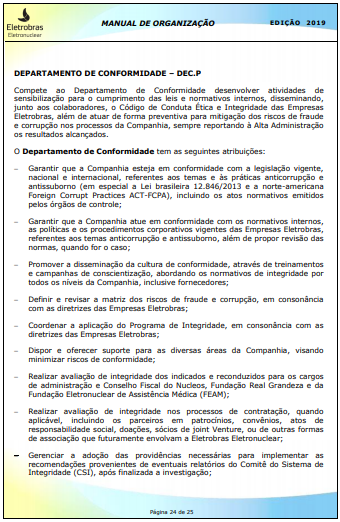 O Regulamento do Programa de Integridade das Empresas Eletrobras tem o objetivo de estabelecer, de forma padronizada, as diretrizes do Programa de Integridade (Compliance) das Empresas Eletrobras, de forma a identificar eventos de fraude e corrupção, para uma ação preventiva e corretiva, em cumprimento à legislação pertinente, na consolidação da cultura de ética e integridade das Empresas Eletrobras.