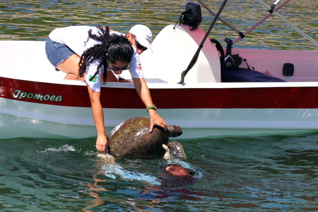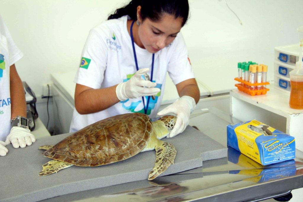 As tartarugas são medidas, pesadas, identificadas as suas espécies e marcadas através da aplicação de grampos metálicos numerados em suas nadadeiras. Após a avaliação, os animais são devolvidos ao seu ambiente.